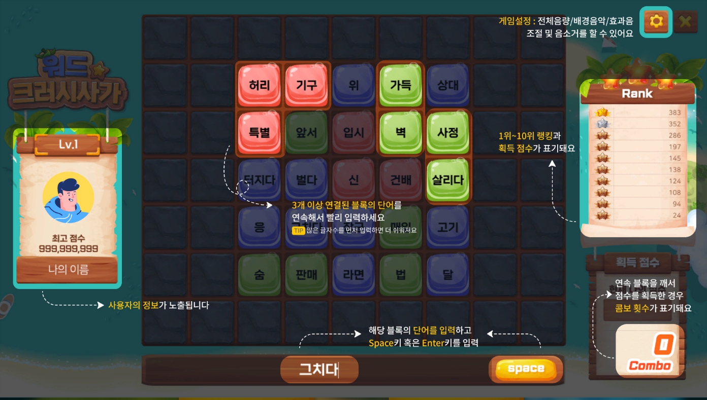 입력해 주면 블록이 파괴되는 형식의 게임이에요.