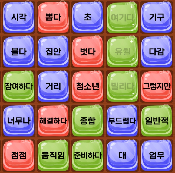 위 사진처럼 같은 색깔 블록이 3개 붙어있는 단어를