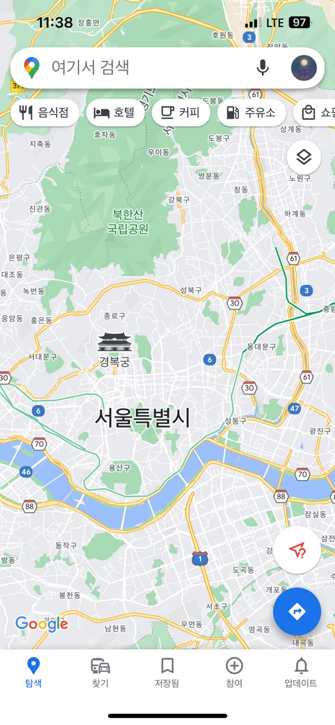 구글맵을 실행하시게 되면 본인의 위치가 파란색 화살표 모양으로 뜰 거예요.