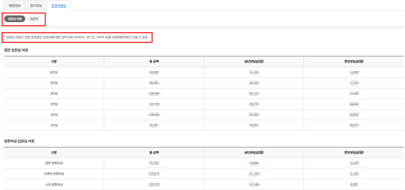 일반 입원실과 중환자실 입원비용도 확인이 가능하고요,