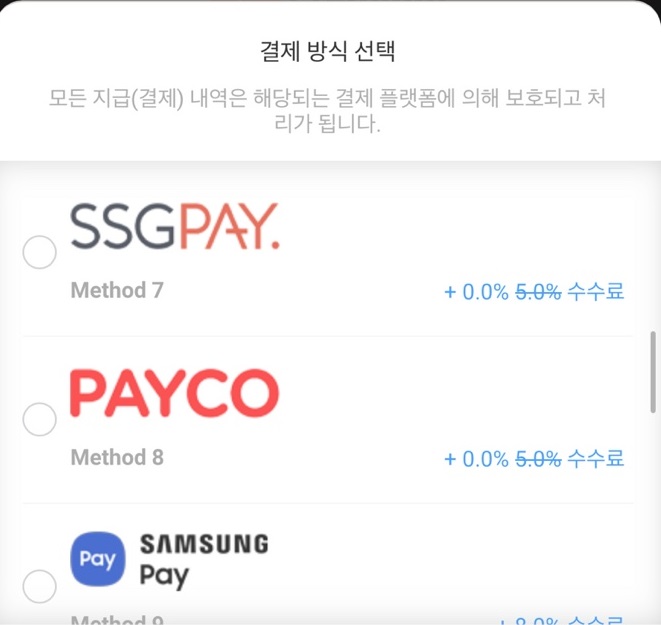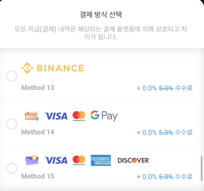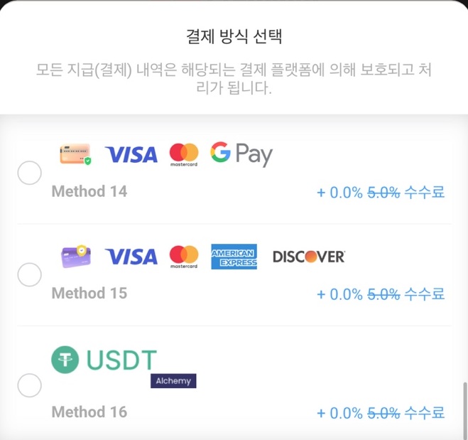 결제방식은 무려 16가지나 있습니다.