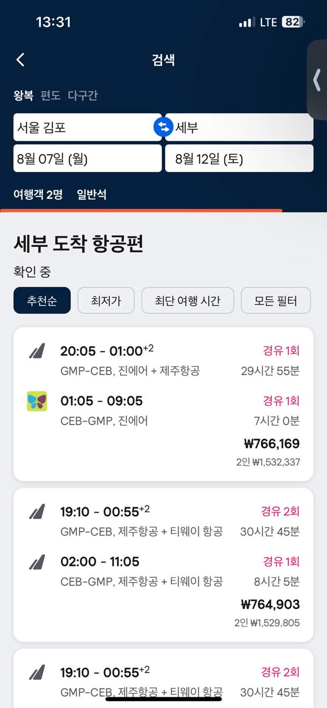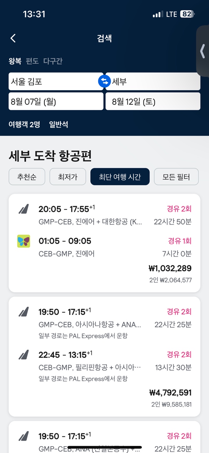 보시다시피 스카이스캐너에서 추천하는 항공편과, 최저가, 최단시간별로 내 입맛에 맞게 검색이 가능해요.