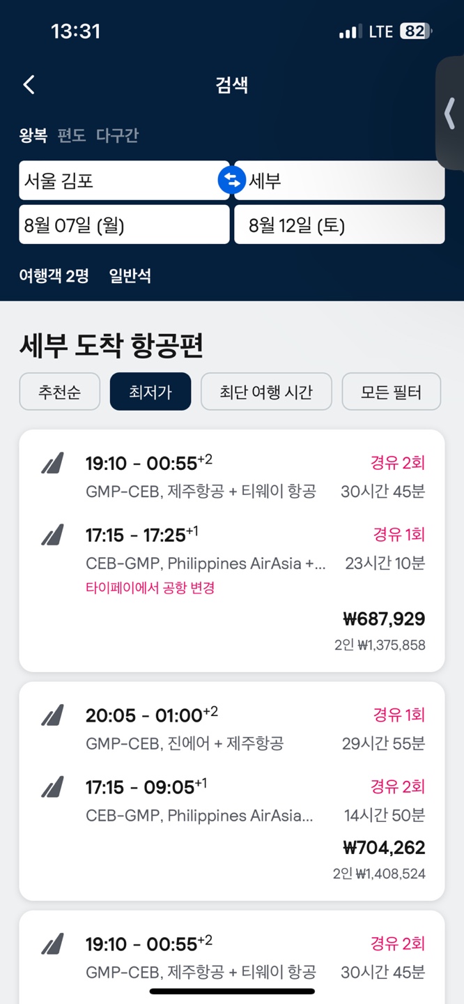 보시다시피 스카이스캐너에서 추천하는 항공편과, 최저가, 최단시간별로 내 입맛에 맞게 검색이 가능해요.